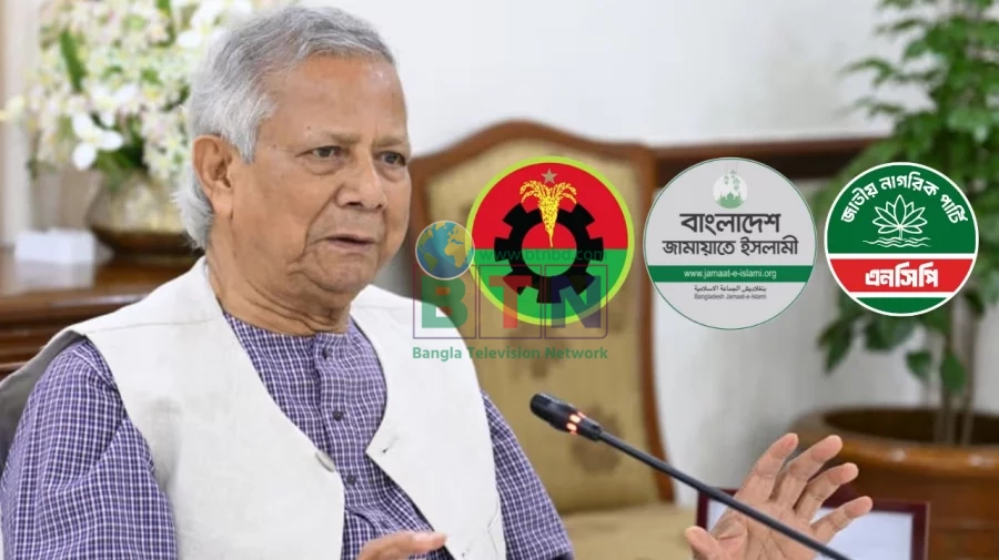 বিটিএন ডেস্কঃ প্রধান উপদেষ্টা ড. মুহাম্মদ ইউনূসের সঙ্গে বৈঠকে বসেছে বিএনপি, জামায়াতে ইসলামী ও জাতীয় নাগরিক পার্টির (এনসিপি) প্রতিনিধি দল।