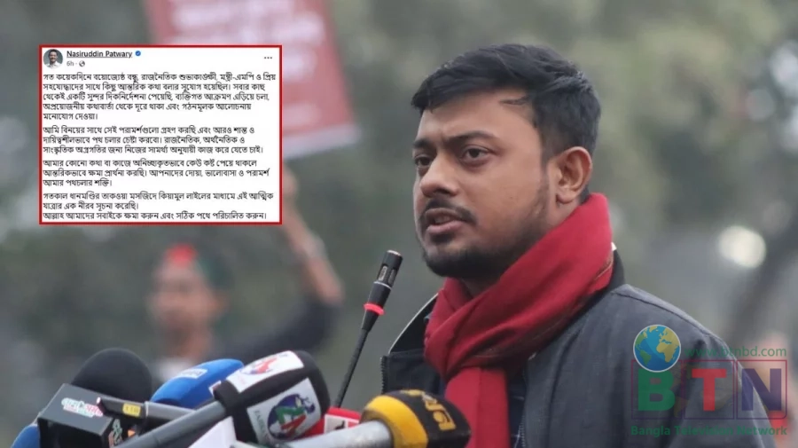 বিটিএন ডেস্কঃ জাতীয় নাগরিক পার্টির (এনসিপি) মুখ্য সমন্বয়ক নাসীরুদ্দীন পাটওয়ারী বলেছেন, তার কোনো বক্তব্য বা আচরণে কেউ কষ্ট পেয়ে থাকলে তিনি আন্তরিকভাবে ক্ষমা প্রার্থনা করছেন।