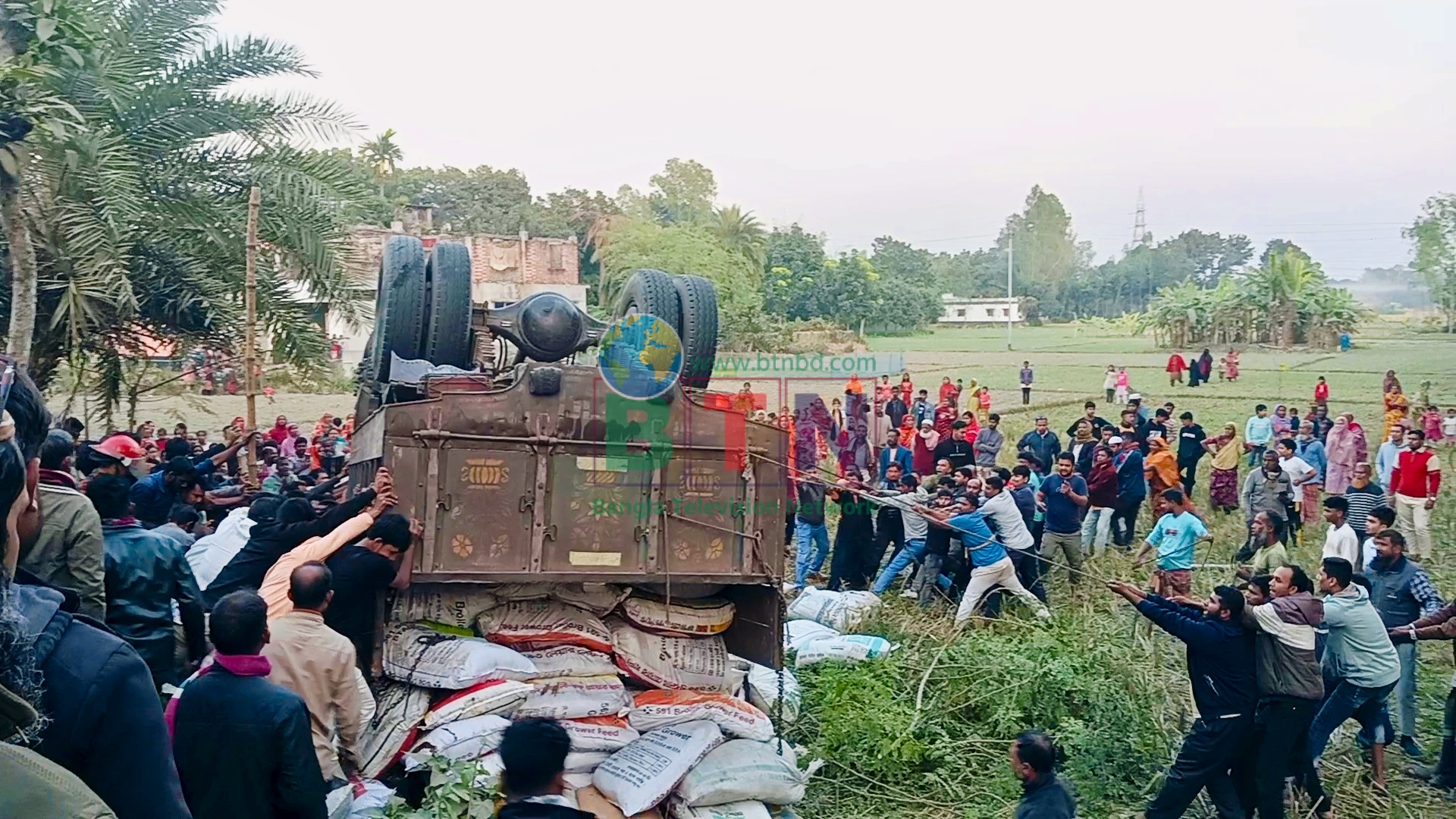 স্থানীয় সূত্রে জানা যায়- নওগাঁ সদর উপজেলার মাদারমোল্লার চারমাথা নামক স্থানে ট্রাকে লিটার (মুরগি বর্জ্য) বহন করে পঞ্চগড়ের উদ্যশ্যে যাচ্ছিল। নওগাঁ-রানীনগর আঞ্চলিক মহাসড়কের পিরোজপুর হিন্দুপাড়া নামক স্থানে ট্রাকটি প্রথমে একটি মোটরসাইকেলকে ধাক্কা দেয়। পরে নিয়ন্ত্রন হারিয়ে ব্যাটারি চালিত অটোরিকশাকে চাপা দিয়ে রাস্তার নিচে উল্টে যায়। এতে ঘটনাস্থলে অটোরিকশা চালক মোতালেব হোসেনে (৫০) মারা যান। এছাড়াও অটোরিকশায় থাকা আরো তিনজন গুরুত্বরআহত হোন।