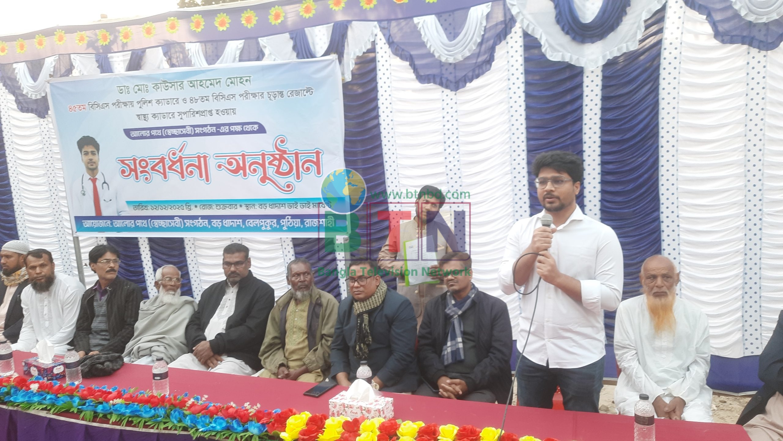 স্টাফ রিপোর্টার পুঠিয়া: ৪৫তম বিসিএস পরীক্ষায় পুলিশ ক্যাডার এবং ৪৮তম বিসিএস পরীক্ষায় স্বাস্থ্য ক্যাডারে সুপারিশপ্রাপ্ত হওয়ায় ডাঃ মো. কাউসার আহমেদ মোহনকে সংবর্ধনা প্রদান করা হয়েছে। পুঠিয়া উপজেলার বেলপুকুরের বড়ধাঁদাস গ্রামে অবস্থিত স্বেচ্ছাসেবী সংগঠন ‘আলোর পথে’-এর আয়োজনে শুক্রবার বিকেল ৪টায় পুঠিয়ার বড়ধাদাসে এ সংবর্ধনা অনুষ্ঠান অনুষ্ঠিত হয়।