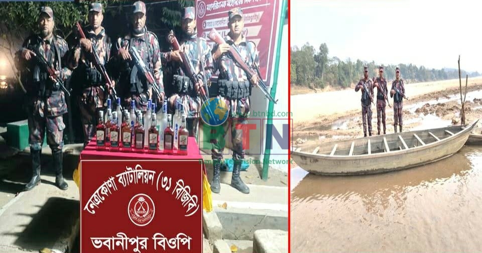 নেত্রকোনার দুর্গাপুর উপজেলায় সীমান্ত এলাকায় সোমেশ্বরী নদীতে মাদকবিরোধী অভিযান চালিয়ে মালিকবিহীন অবস্থায় ২৩ বোতল ভারতীয় মদ এবং চোরাচালান কাজে ব্যবহৃত একটি নৌকা জব্দ করেছে বর্ডার গার্ড বাংলাদেশ (বিজিবি)।